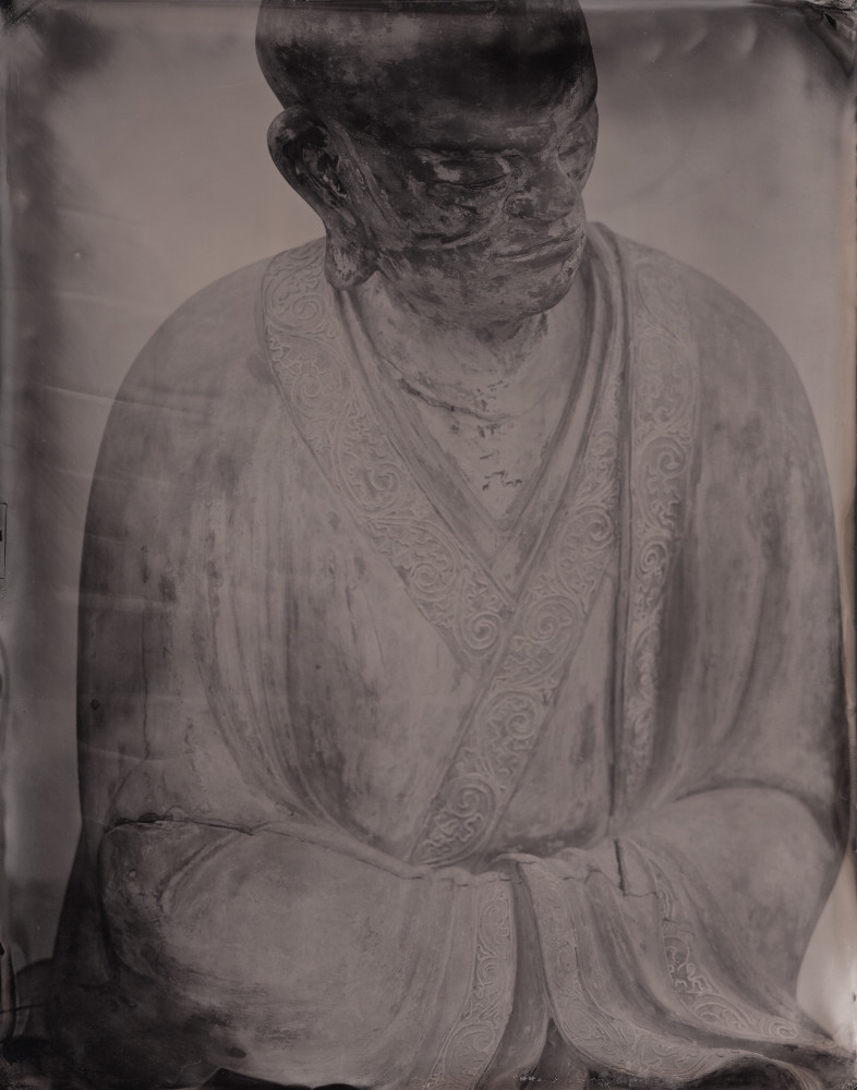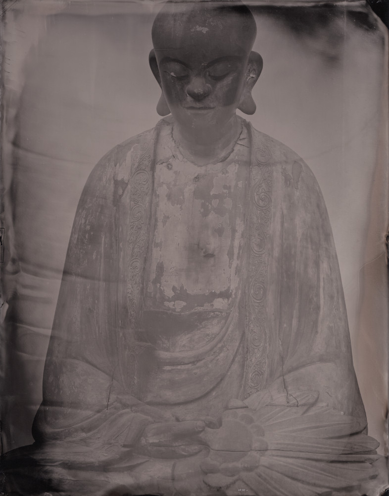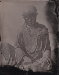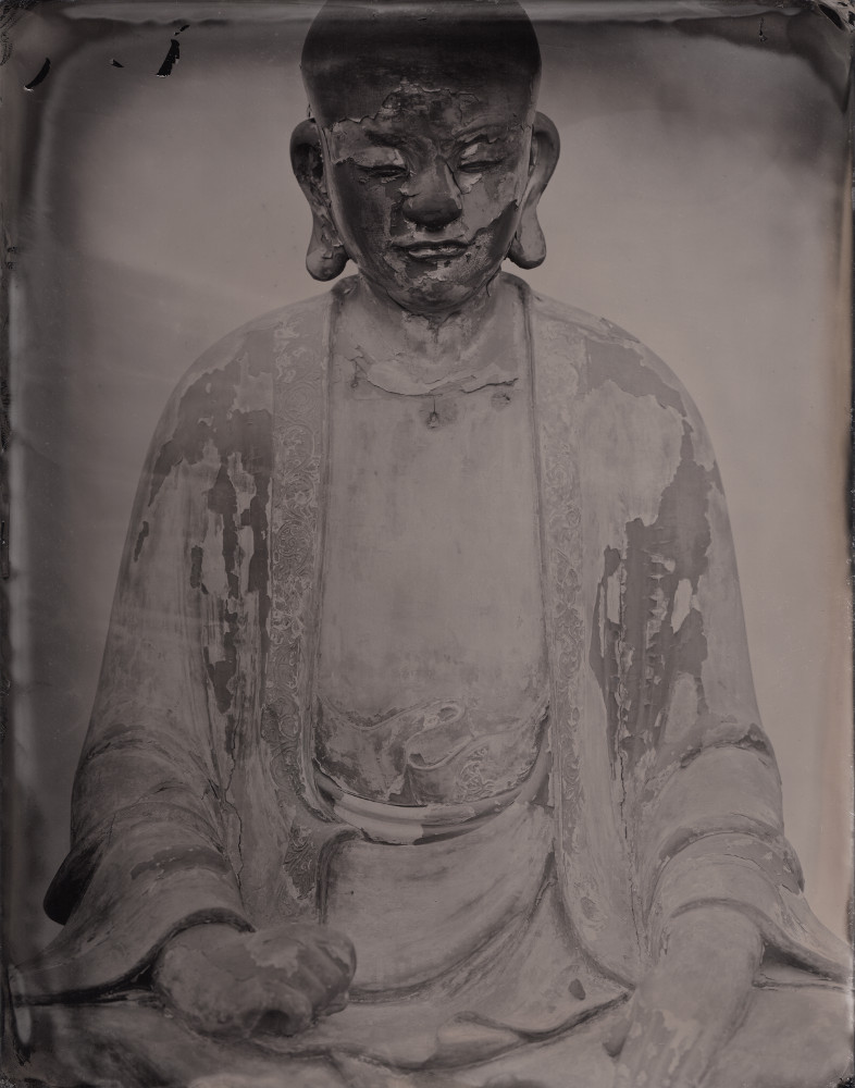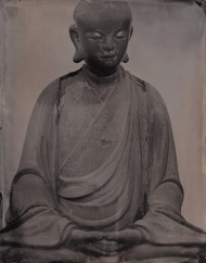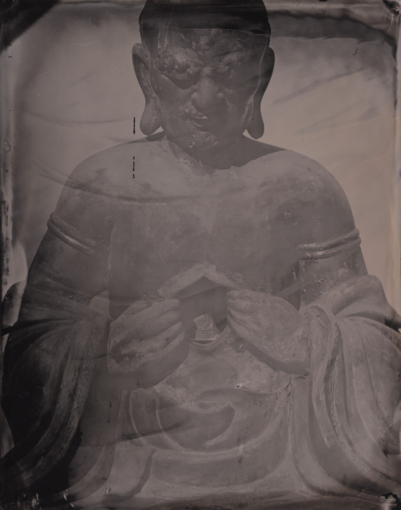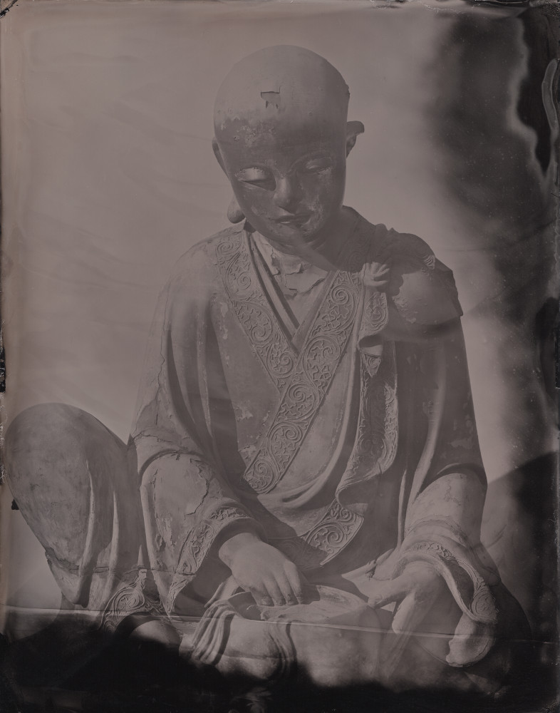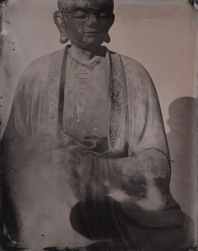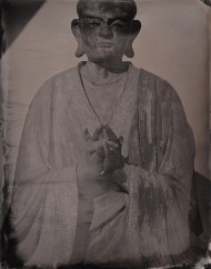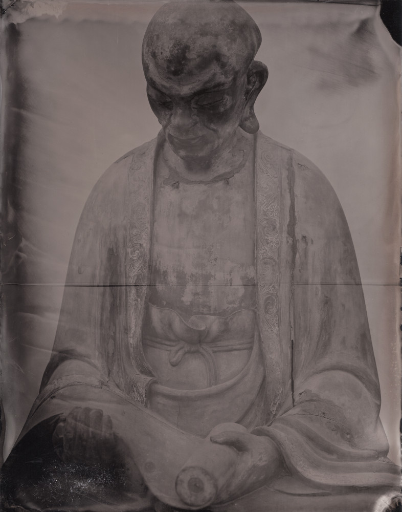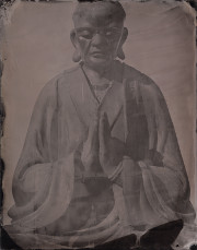 今写真家 大和田良さんが羅漢像を撮影した写真技法「コロジオン湿板写真」。歴史の本などで見られる、坂本竜馬の肖像写真と同じ技法です。